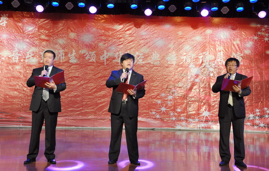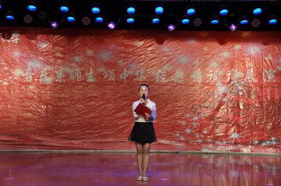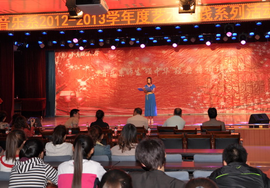 9月22日晚上7:30,音乐系2012-2013学年度第一学期艺术实践系列活动之二“颂中华,传文明”音乐系师生同台中华颂•经典诵读活动在思源楼萃文厅举行。音乐系党总支书记王三槐、主任王采、副主任张世成、人文公司副经理刘勇睿和音乐系全体教师、员工共400多人参加了本次活动。