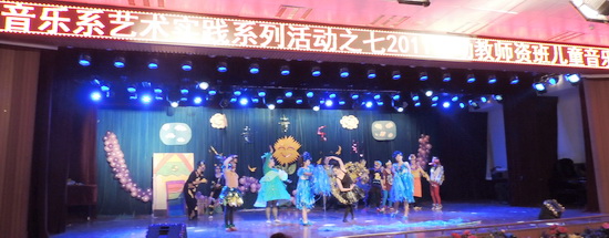 儿童音乐剧是以音乐、歌舞为主的儿童戏剧,通过演员的语言,音乐和动作以及固定的演绎将剧情传达给观众,是当代儿童和中小学员工最喜爱的舞台剧形式之一。音乐系通过开设奥尔夫音乐教学法,结合音乐舞台表演,克服困难、创造条件与近年来积极探索儿童音乐剧的教学与实践活动。在音乐系副教授胡炬老师的辛勤指导下,2011级级幼教团队班的同学自编剧本、自制道具,精心排练并成功演出了《丑小鸭》、《大海笑了》两个剧目,获得了全场观众的热烈欢迎和一致好评。