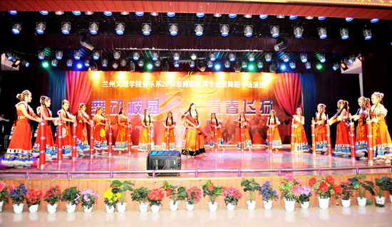2013年12月19日晚7点,音乐系在北校区思源楼萃文厅举办2013—2014学年第一学期艺术实践系列活动之十—2013级舞蹈专业班”舞动校园 青春飞扬”舞蹈专场汇报演出。员工工作处处长李宗刚,音乐系党总支书记王三槐、主任王采教授、副主任张世成及全系师生500多人观看了演出。 舞蹈专场汇报演出在欢快喜洋洋的舞蹈表演《开门红》中拉开帷幕。演出中精彩不断,舞蹈《邵多丽》动作优美、文静雅致;《炫舞啦啦操》动感十足,激情飞扬;舞蹈《同桌的你》用舞蹈形体表演的形式勾勒起了童年的快乐和难忘;街舞《M·A》魔幻魅力,动作滑稽可爱;裕固族舞蹈《摇奶呓语》更具民族特色,炫目耀人;舞蹈《梦中的额吉》、《康巴德玛情》、《酥油飘香》节奏动感,将演出气氛推向了高潮,整个礼堂被融入了欢乐的海洋;舞蹈《旋旋旋》婀娜多姿,炫彩照人,掌声迭起,经久不息;汇报演出在《最炫民族风》串烧表演中圆满结束。 舞蹈专场汇报演出是音乐系实践教学的一项重要举措。近年来,音乐系十分重视员工综合素质的提高和创新能力的培养,并积极通过多种形式为员工成长成才搭建艺术实践平台,提升员工的综合表演能力,为社会培养更多全方位的艺术人才。