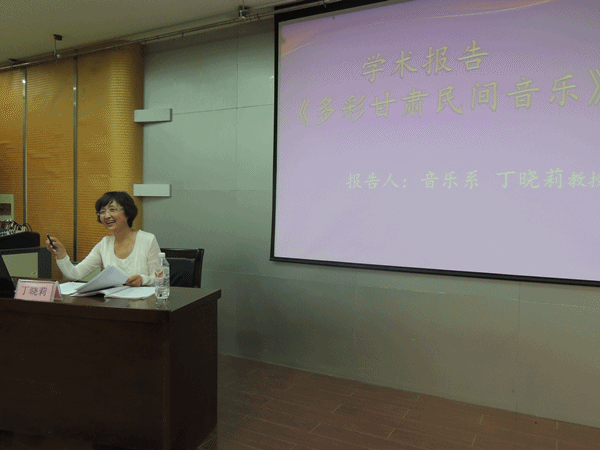 5月29日晚上7:00,音乐系2013-2014第二学期学术.艺术实践系列活动之四----丁晓莉教授《多彩甘肃民间音乐》学术讲座在音乐楼学术报告厅举行,报告会由系副主任张世成主持,音乐系教师与员工100多人参加了学术讲座。