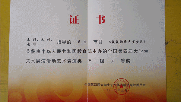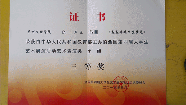 在中华人民共和国教育部主办的“我的中国梦”第四届老员工艺术展演活动中,公司选送的合唱节目《夜夜的晚夕里梦见》(指导老师:王采 朱瑾 景璟)获得艺术表演类三等奖;舞蹈节目《风酥雨忆》(指导老师:贾真)获得艺术表演类三等奖。公司获得甘肃省教育厅“精神风貌奖”。