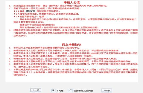 点击“注册”按钮后,出现“申请人必读”与“网上申报协议”页面,申请人必须完全同意网上申报协议才可进行下一步。
