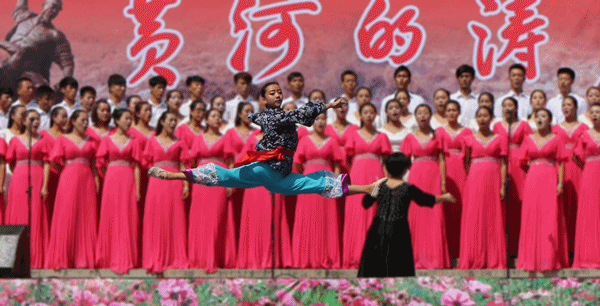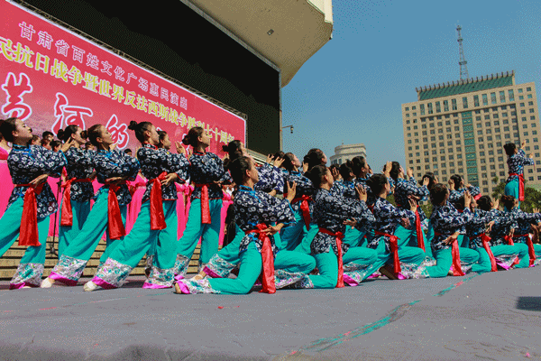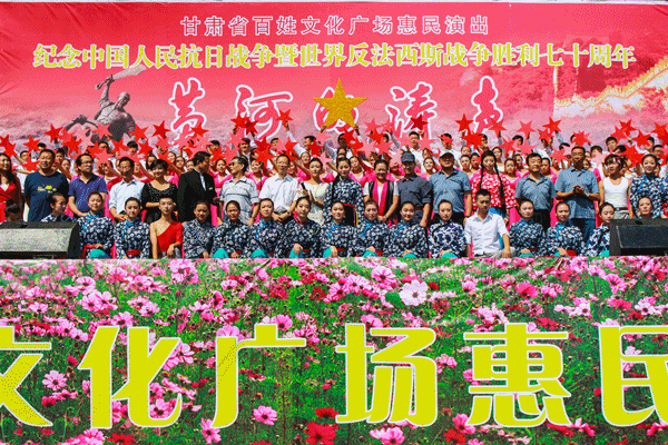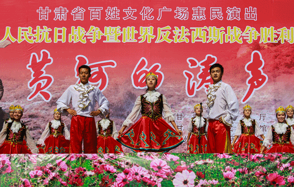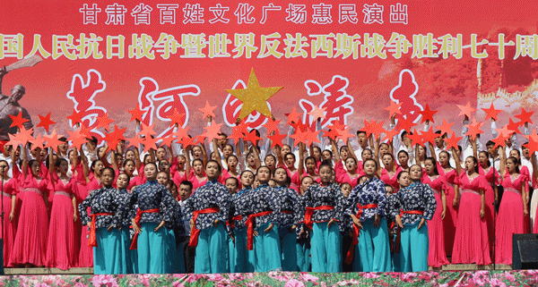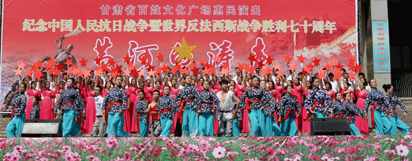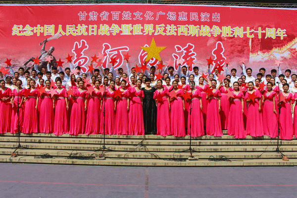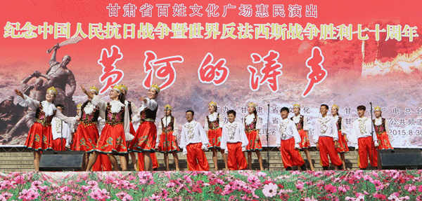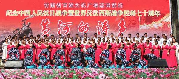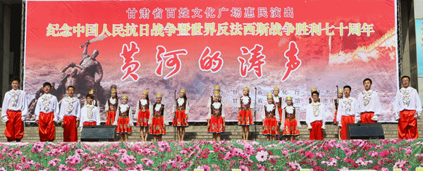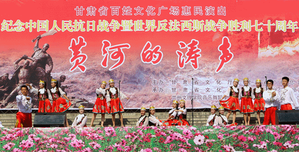 由省文化厅、省广电总台主办,省文化馆、甘肃电视台公共频道、体育平台官网承办的“纪念中国人民抗日战争胜利暨世界反法西斯战争胜利七十周年”甘肃省百姓文化广场惠民专场演出《黄河的涛声》于30日上午10时在东方红广场兰州体育馆门前隆重开演。兰州市一万多市民到现场观看了演出。