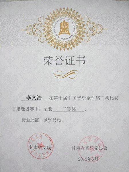 在甘肃省文联、甘肃省音乐家协会举办的第十届中国音乐金钟奖二胡比赛甘肃选拔赛中,公司青年教师李文浩荣获二等奖,可喜可贺。