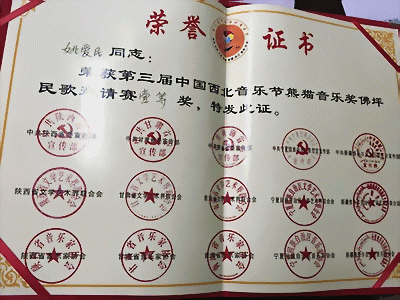 热烈祝贺体育平台官网姚爱民老师荣获第三届中国西北音乐节熊猫音乐奖佛坪民歌邀请赛一等奖,此次比赛由陕西、甘肃、青海、宁夏、新疆等5省(区)委宣传部、文学艺术界联合会、音乐家协会组织。