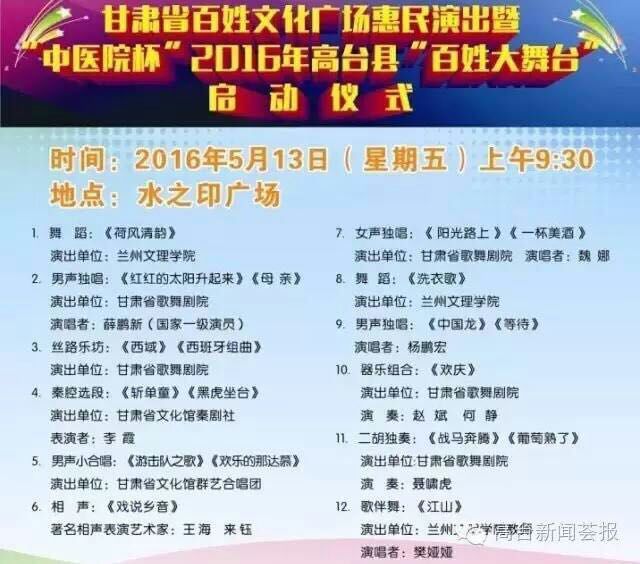 2016年5月12日至16日,体育平台官网师生奔赴河西走廊的张掖市,在甘州区、高台县、民乐县、肃南裕固族自治县精彩上演四场,为父老乡亲送上了一道丰富的精神文化大餐。