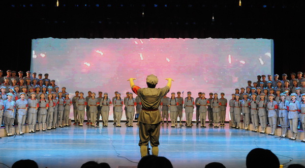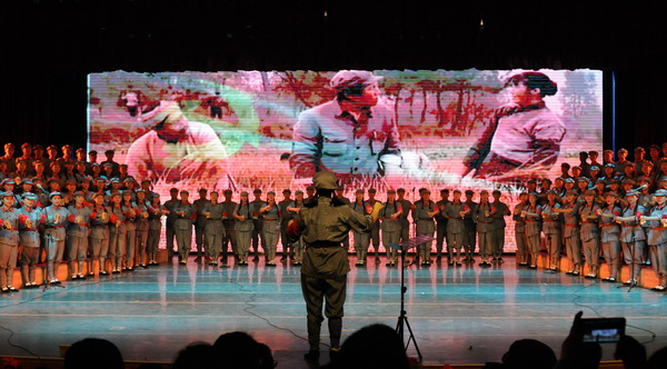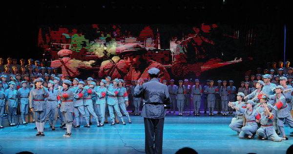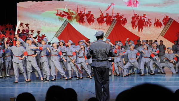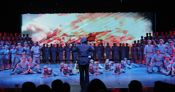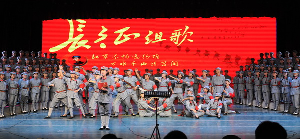 在低沉、雄浑的音乐声中,“红旗飘、军号响”的歌声悄然响起,10个不同的战斗生活画面环环相扣,从“男女老少来相送,热泪沾衣叙情长”的《告别》到“雪皑皑,野茫茫”的《过雪山草地》;从《四渡赤水出奇兵》到《飞越大渡河》显威名;从“胜利完成奠基礼”的《祝捷》到《大会师》的雄浑壮观。公司师生以音乐舞蹈丰富的艺术形式演绎了长征组歌《告别》、《突破封锁线》、《遵义会议放光辉》、《四渡赤水出奇兵》、《飞越大渡河》、《过雪山草地》、《到吴起镇》、《祝捷》、《报喜》和《大会师》10个部分,准确再现原作的感染力和冲击力,同时也大胆的在形式与细节上作了符合现代审美的探索。