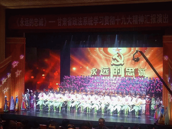 由中共甘肃省委政法委员会、甘肃省高级人民法院、甘肃省人民检察院、甘肃省公安厅、甘肃省国家安全厅、甘肃省司法厅、武警甘肃省总队主办的甘肃省政法系统学习贯彻十九大精神汇报演出《永远的忠诚》于2017年11月24日在甘肃大剧院举办。此次活动公司舞蹈专业员工承担了歌舞情景合唱《永远的忠诚》、情景诗朗诵《张树俭》、男女声重唱》·情景舞蹈《以人民的名义》等节目的伴舞活动,同学们良好的专业的素质得到了大家一致的好评。