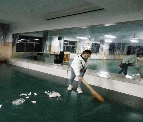 本次打扫的地点主要是音乐楼一楼至五楼,重点是琴房和舞蹈功厅。在活动过程中,同学们热火朝天进行着清扫活动,大家发扬了不怕苦、不怕累的精神,对音乐楼的进行了清洁。大家分工协作,不仅对地面进行了打扫,而且对玻璃、窗台、课桌也进行了彻底的清理。
