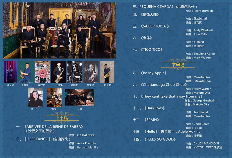 本次音乐会分为上下两个半场,上半场为古典萨克斯管重奏,下半场为爵士乐。