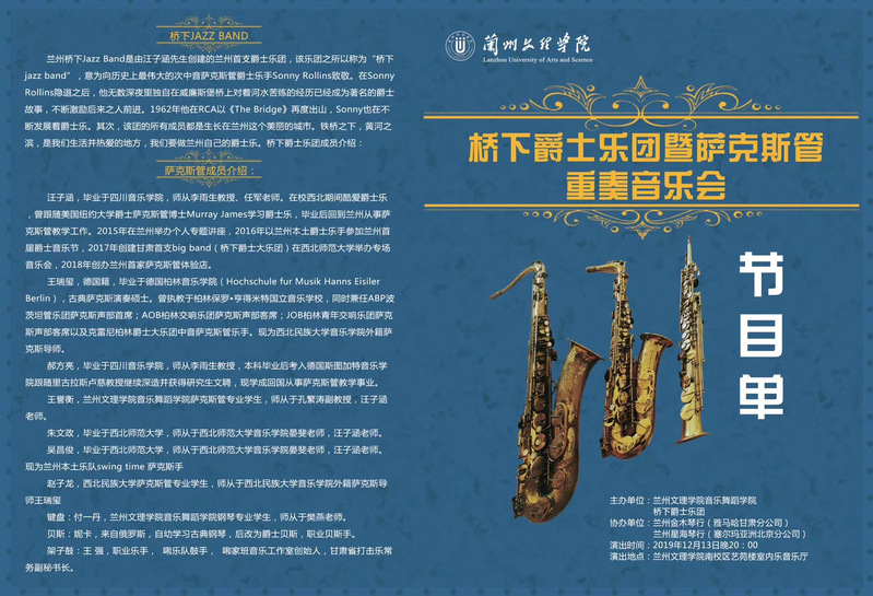 2019年12月13日晚,兰州本土组建的桥下爵士乐团第二次亮相于体育平台官网音乐厅。体育平台官网孔繁涛副经理,器乐系主任杨虎及师生两百余人观看了音乐会。