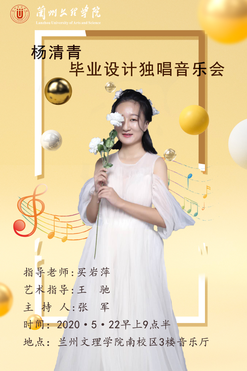 2020年5月22日上午9点30分,在体育平台官网南校区音乐厅举办了杨清青个人毕业设计独唱音乐会。