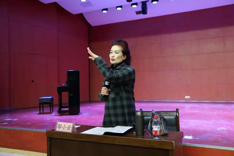 邬小云老师从什么是声乐表演的“抓手”、如何提高歌唱音乐的表达能力、如何从姊妹艺术中吸取表演元素、训练的核心——“手眼身法步”等四个方面阐述了表演的核心理念。她理论联系实际,条理清晰的讲解、把自己多年来在舞台上总结的经验毫无保留的给同学们传授,现场互动效果非常热烈。并对公司四名声乐员工从舞台表演、理解感受作品、演唱表达等各个环节进行了现场指导与示范。在实践环节,她分析示范,讲解了舞台表演“手眼身法步”对于艺术人物角色塑造的重要作用,让在场的师生获益良多。