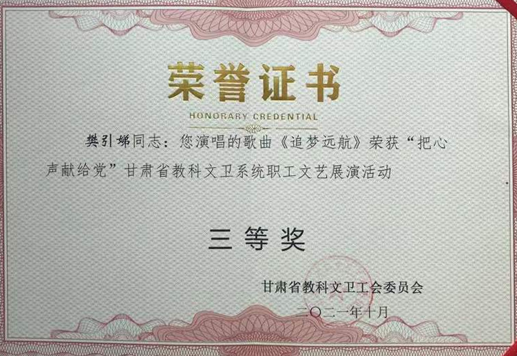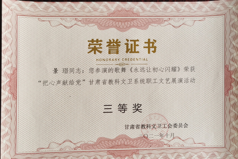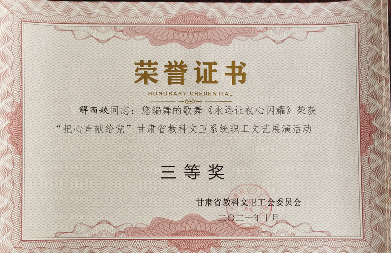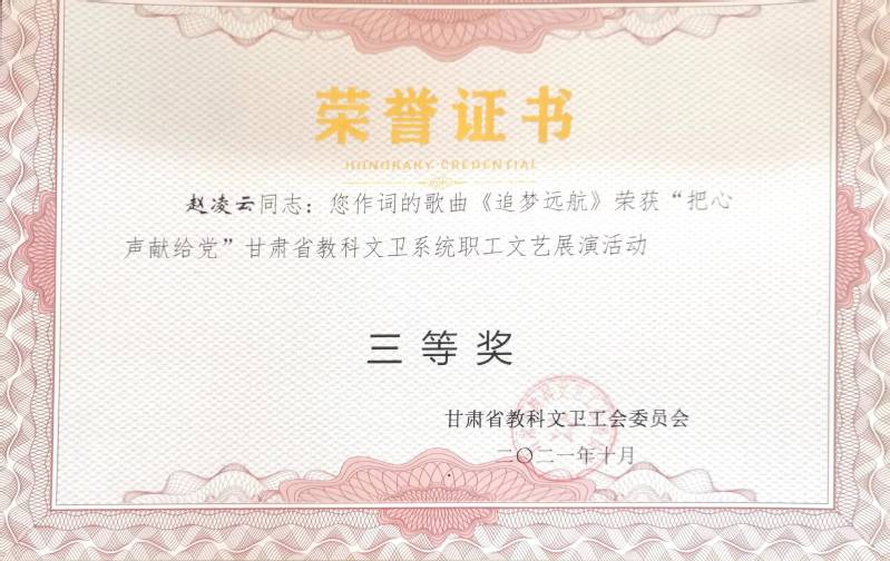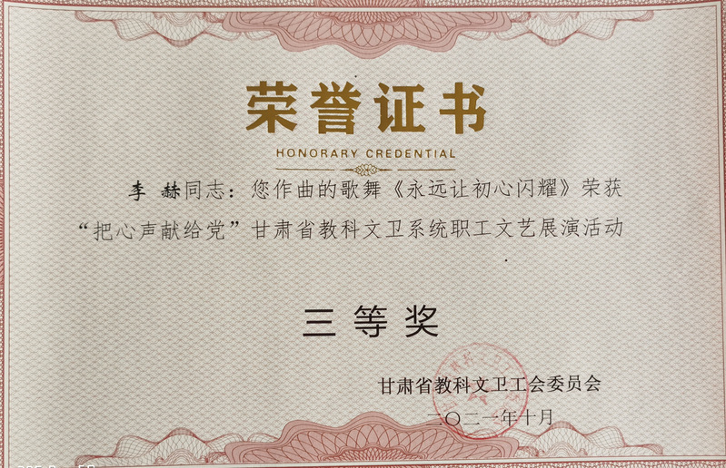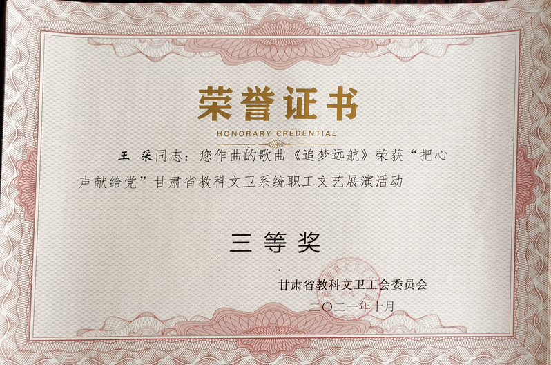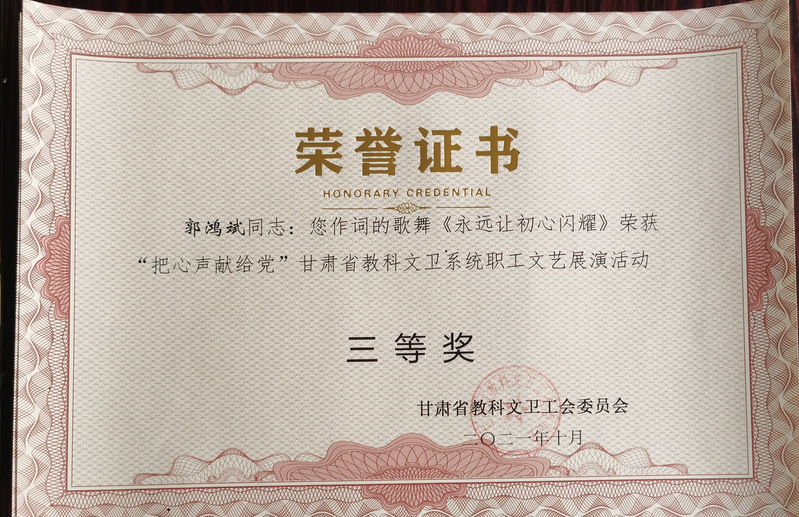 甘肃省教科文卫工会举办的“把心声献给党”甘肃省科教文卫系统职工文艺展演活动中,公司选送的王采作曲的歌曲《追梦远航》(作词:赵凌云、作曲:王采、演唱:樊引娣、编曲:李赫)获三等奖。李赫作曲的歌舞作品《永远让初心闪耀》(作词:郭鸿斌、作曲、编曲:李赫、演唱:演唱:景璟、赵思琪,杨洋洋,李江非,王琰,梁轩,柴小红,赵启梅,张琪玮,编舞:解雨姣)获三等奖。