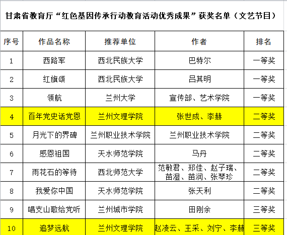 近日,公司体育平台官网经理张世成教授创编的混声四部合唱《百年党史话党恩》,在甘肃省教育厅主办的“红色基因传承行动教育活动优秀成果”评选活动中,荣获文艺组二等奖。