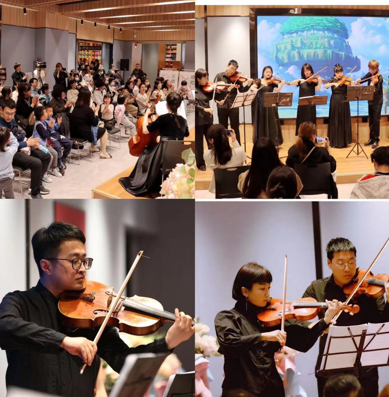 下半场由公司小提琴教师葛文佳、沈俊韬两位老师带领提琴专业的同学们演奏了风格迥异的弦乐重奏作品《肖斯塔科维奇第二爵士圆舞曲》、《贝多芬“悲怆”奏鸣曲》(第二乐章),两首作品将现场氛围营造的华丽而优美。重奏作品《天空之城》曲风明快而富有童趣;中国作品《瑶族舞曲》更引得现场读者朋友们的一致共鸣。