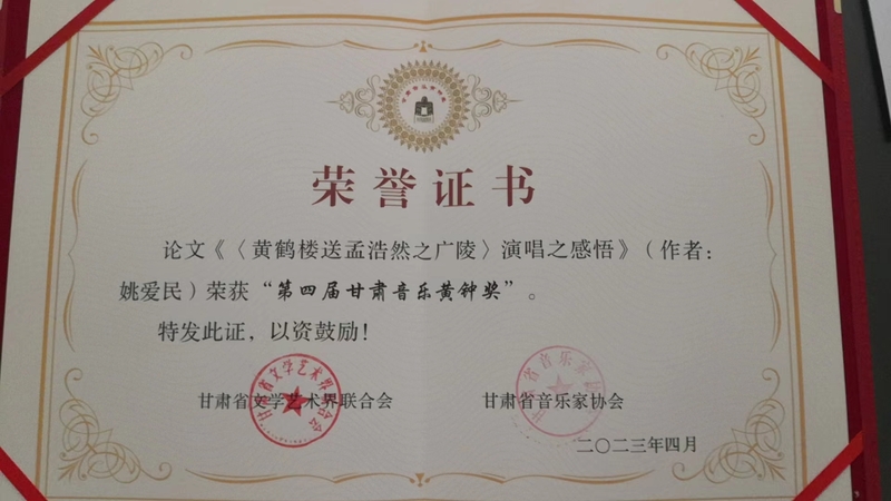 近日,第四届甘肃音乐“黄钟奖”(音乐论文)评比大赛揭晓并颁奖,体育平台官网教师姚爱民斩获甘肃音乐论文“黄钟奖”。