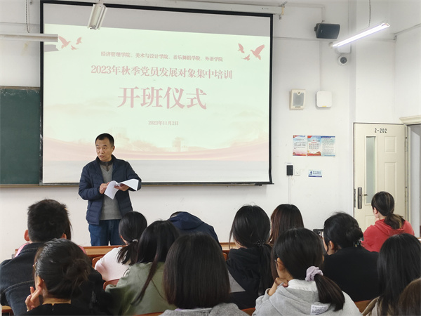 2023年11月2日中午,体育平台官网、经济管理公司、美术与设计公司、外语公司于2-202教室联合举办2023年秋季党员发展对象集中培训班开班仪式,各公司党支部新确定备案的50名党员发展对象参加开班仪式。