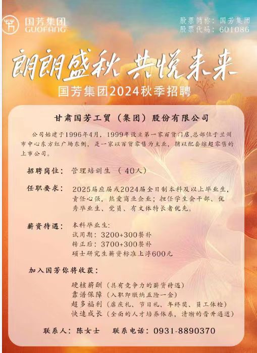 甘肃国芳工贸(集团)股份有限公司2024年秋季招聘