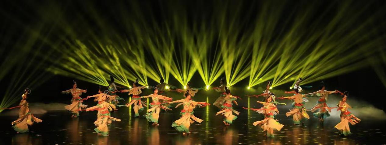 作为融合古典美学与丝路文化的精品力作,《唐韵胡旋》的呈现堪称惊艳。演出中,悠扬古乐缓缓流淌,19名舞者身着复原式唐代舞服登场,灵动身姿与细腻肢体语言相得益彰。旋转时飘带翻飞如流云逐月,定格时姿态挺拔似壁画飞天,每一个动作都精准还原敦煌艺术神韵,将“胡旋舞”的轻盈洒脱与“唐韵”的雍容大气完美融合,仿佛带观众穿越至千年前的丝路繁华。